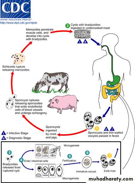 Sarcocystis infections occur world wide . Only two species of Sarcocystis are known to utilize humans as a definitive host: Sarcocystis hominis and S. suihominis. They are known as human intestinal parasites. Humans Infection results from ingestion of raw or insufficiently cooked meat from cattle or pigs, which frequently contains muscle cysts of these species. They infect numerous animals . In human the frequency of Sarcocytis infection is relatively low .Life cycle :