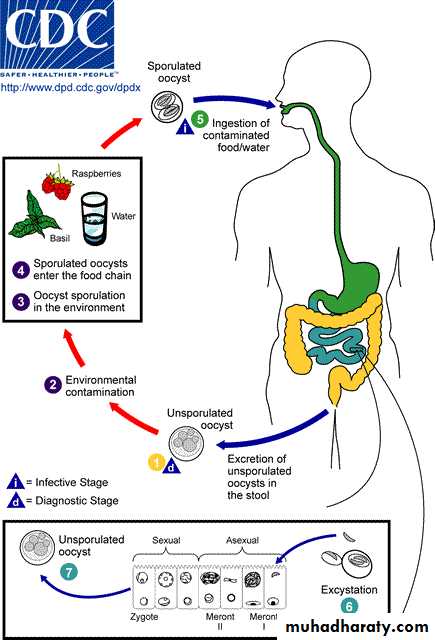 Cyclospora cayetanensis has a simple life cycle . When freshly passed in stools, the oocyst is not infective. In the environment , sporulation occurs after days or weeks at temperatures between 22°C to 32°C, resulting in division of the sporoblast into two sporocysts, each containing two sporozoites . the sporulated oocysts are ingested (in contaminated food or water) . The oocysts excyst in the gastrointestinal tract, freeing the sporozoites which invade the epithelial cells of the small intestine . Inside the cells they undergo asexual multiplication (schizogony ) to produce merozoites`that enter new cells, then sexual development (gametogony) initiate by forming micro and macrogametes followed by syngamy to form zygote which is develop to oocysts , which will be shed in stools .Clinical features :