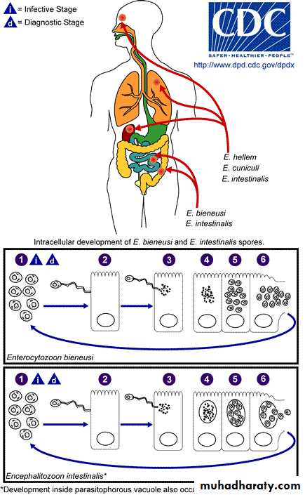 The spore extrudes its polar tubule and infects the host cell . The spore injects the infective sporoplasm into the eukaryotic host cell through the polar tubule . Inside the cell, the sporoplasm undergoes extensive multiplication either by merogony (binary fission) or schizogony (multiple fission) . This development can occur either in direct contact with the host cell cytoplasm (e.g., E. bieneusi) or inside a vacuole termed parasitophorous vacuole (e.g., E. intestinalis). Either free in the cytoplasm or inside a parasitophorous vacuole, microsporidia develop by sporogony to mature spores . During sporogony, a thick wall is formed around the spore, which provides resistance to adverse environmental conditions. When the spores increase in number and completely fill the host cell cytoplasm, the cell membrane is disrupted and releases the spores to the surroundings . These free mature spores can infect new cells thus continuing the cycle.Clinical features :