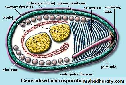Microspora spp the causative agents of microsporosis or intestinal microspordiosis. The most important species are Enterocytozoon bieneusi and Encephalitozoon intestinalis. Transmission is by characteristic spores. They are parasites with intracellular development and spore formation. The host spectrum ranges from numerous invertebrates (e.g., protozoa, insects) to many species in all classes of vertebrates.Morphology :