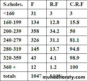 Ex: In a study, we have the following table for serum cholesterol of 1047 male patients aged 40-59 year.
