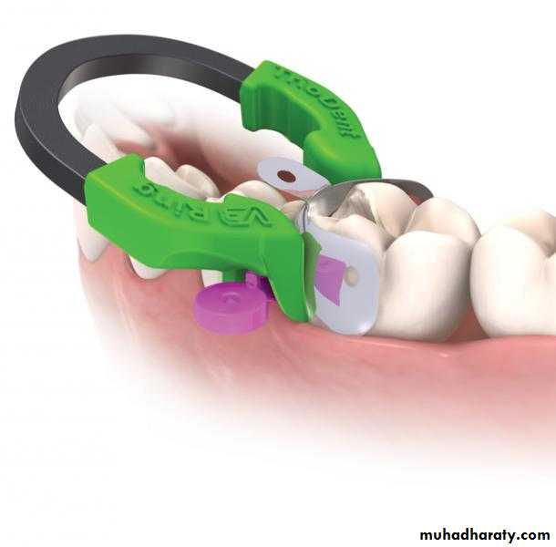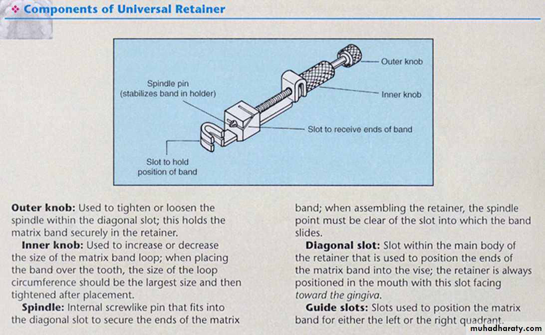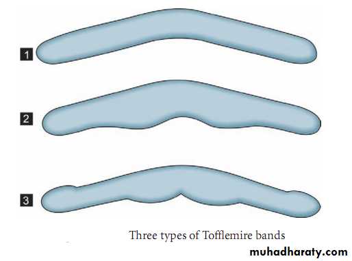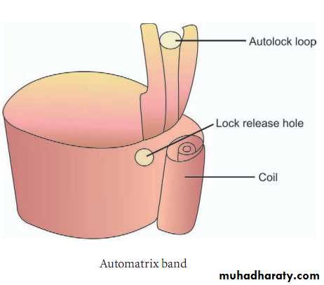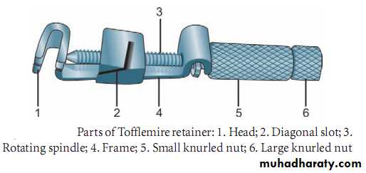 It was designed by Dr BF Tofflemire. It is also well known as ‘universal’ matrix because it can be used in all types of tooth preparations of posterior teeth.In this, the matrix band is fitted onto the retainer and then fitted loosely over the tooth, which then can be tightened in position by means of the screw