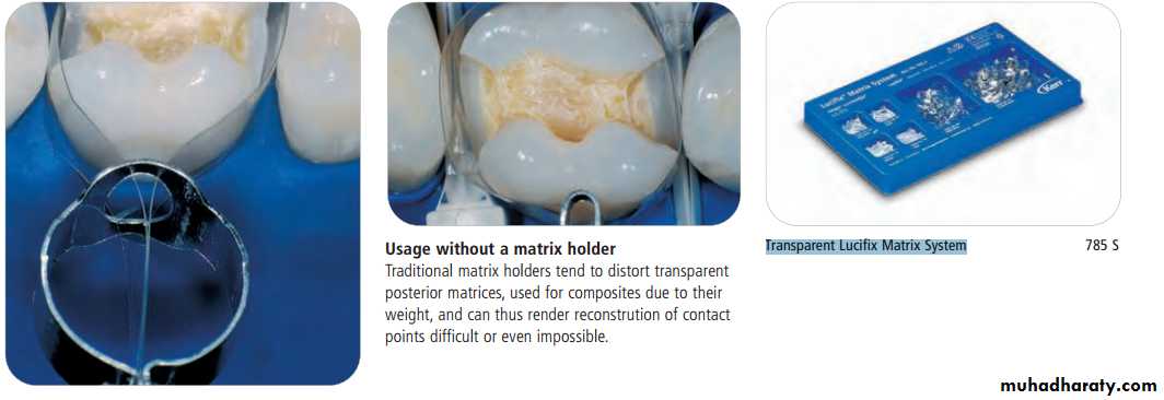 These type of matrix systems offers a unique solution by combining a wedge and a matrix in its design, allowing for fast and efficient approximal contacts for Class II restorations. This one-piece wedge and matrix inserts as easy as a wedge and can be placed in only 5 seconds.No ring requiredAchieve restorations with natural contact and tight cervical margins