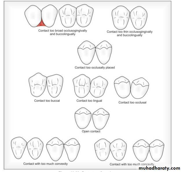 The contact tends to be centered buccolingually below the marginal ridges.The contact tends to be highly convex in its middle and occlusal thirds.