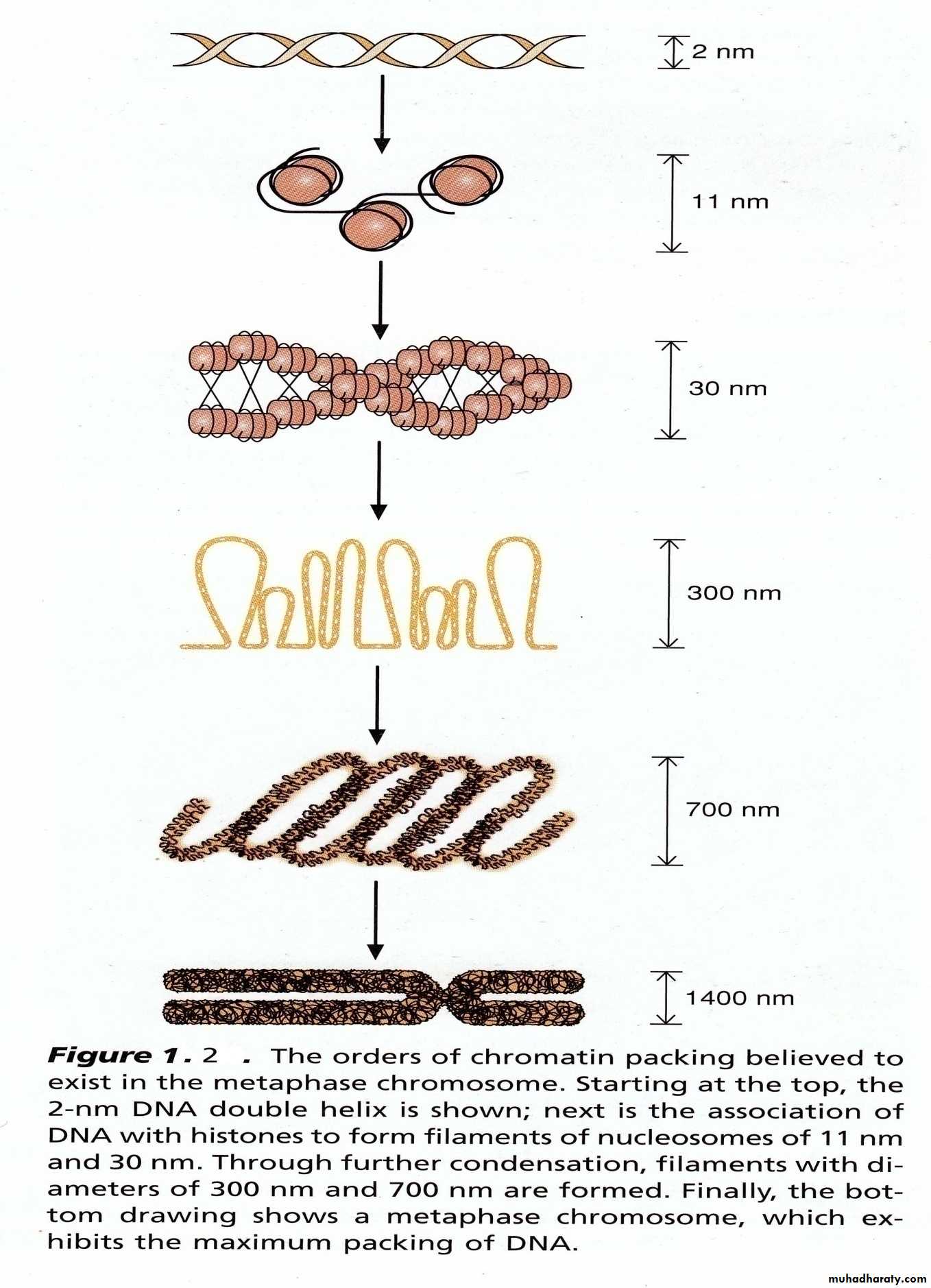 Each chromosome (chromatin) is made up of fine filaments that are composed of DNA chain bound to basic proteins (mainly histone)The basic unit is the nucleosome (histone + 140 base pairs of DNA).