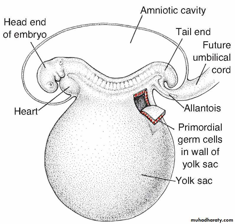 Germ cells are derived from primordial germ cells (PGCs) that are formed in the epiblast during the 2nd week of development that move to the wall of the yolk sacAt the end of 3rd week can be seen in the dorsal wall of the yolk