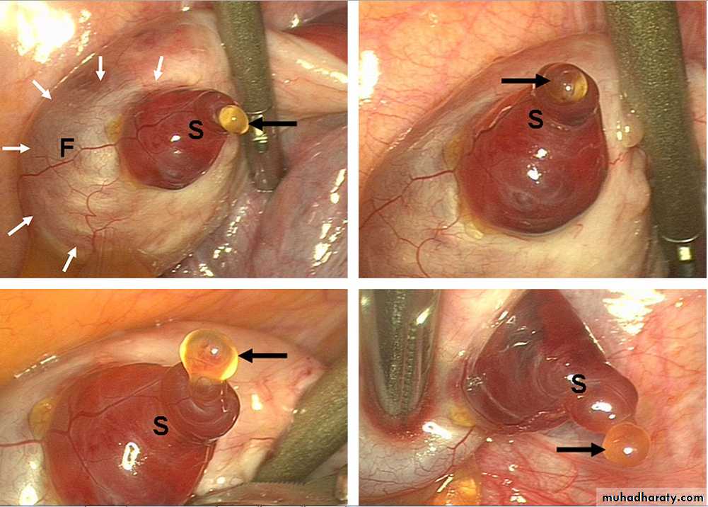The surface of the ovary begins to bulge locally, and at the apex, an avascular spot, the stigma, appearsThe high concentration of LH increases: -collagenase activity so digestion of collagen fibers surrounding the follicle. -Prostaglandin levels local muscular contractions in the ovarian wall