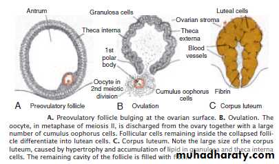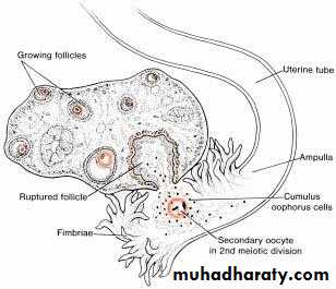 Shortly before ovulation, fimbriae of the oviduct begin to sweep over the surface of the ovary, and the tube itself begins to contract rhythmicallyThe ovulated oocyte with its surrounding cumulus cells swept into the uterine tube by the action of the tubal fimbriae and its moving ciliated epithelium, the tube contract rhythmically pushing the oocyte to reach the uterine lumen in about 4 days.