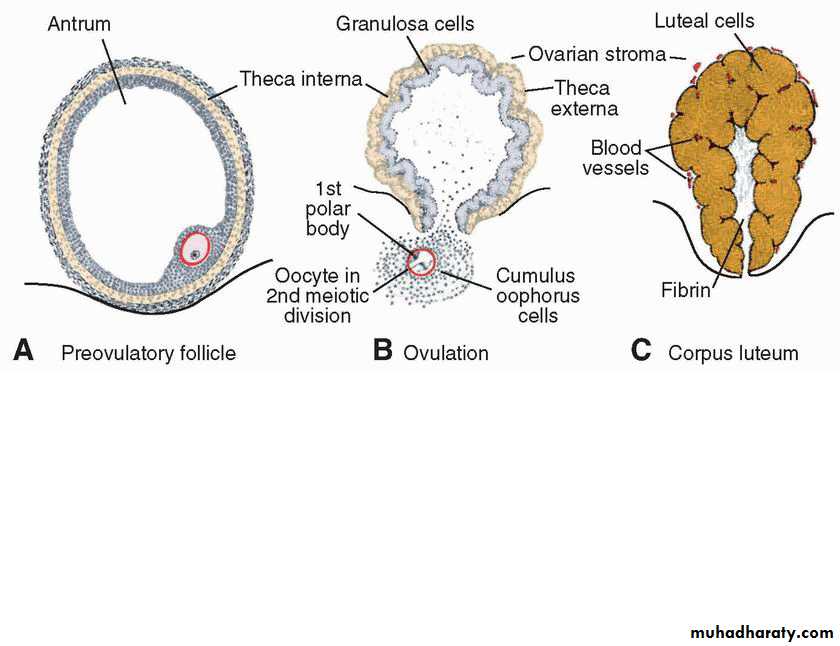 by follicular stromal cells (luteinization); and (c) causes follicular rupture and ovulation.
