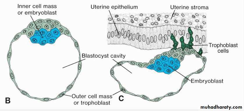 Inner cells of the morula constitute the inner cell mass, and surrounding cells compose the outer cell mass.The inner cell mass gives rise to tissues of the embryo proper, and the outer cell mass forms the trophoblast, which later contributes to the placenta.