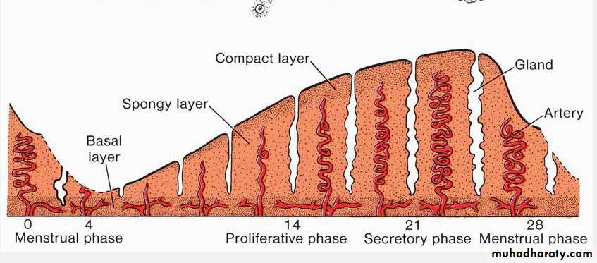 Beginning of Menstrual phase where blood is escape with shedding of the compact and spongy layers of the mucosa.