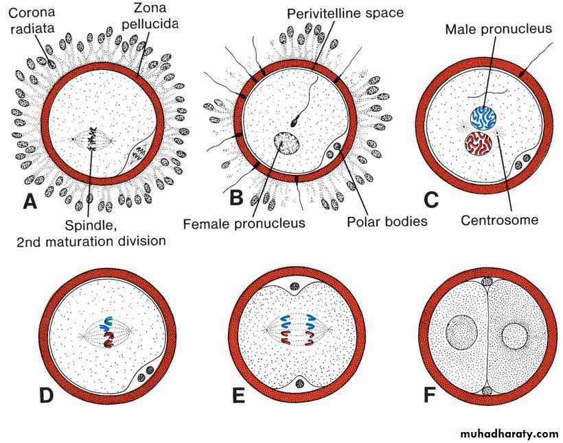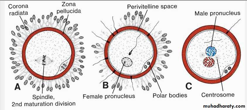 Oocyte immediately after ovulation, showing the spindle of the second meiotic division. B. A spermatozoon has penetrated the oocyte, which has finished its second meiotic division. Chromosomes of the oocyte are arranged in a vesicular nucleus, the female pronucleus. Heads of several sperm are stuck in the zona pellucida. C. Male and female