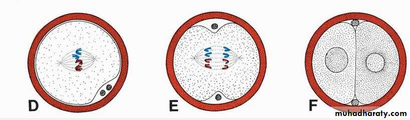 D,E. Chromosomes become arranged on the spindle, split longitudinally, and move to opposite poles. F. Two-cell stage.