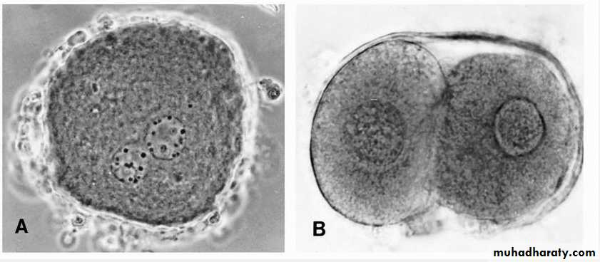 Phase contrast view of the pronuclear stage of a fertilized human oocyte with male and female pronuclei. B. Two-cell stage of human zygote.