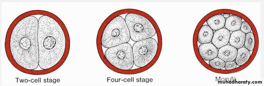 Development of the zygote from the two-cell stage to the late morula stage. The two-cell stage is reached approximately 30 hours after fertilization; the four-cell stage is reached at approximately 40 hours; the 12- to 16-cell stage is reached at approximately 3 days; and the late morula stage is reached at approximately 4 days. During this period, blastomeres are surrounded by the zona pellucida, which disappears at the end of the fourth day.