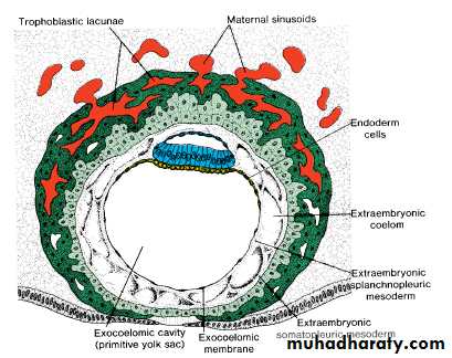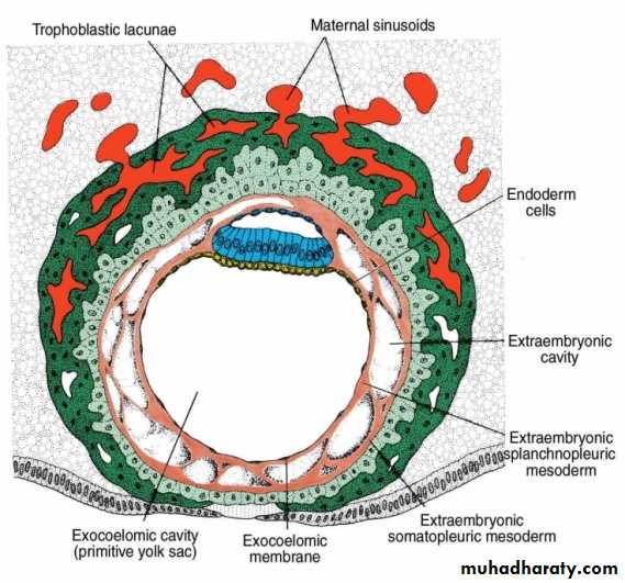 The syncytiotrophoblast shows a large number of lacunae.Flat cells form the exocoelomic membrane.