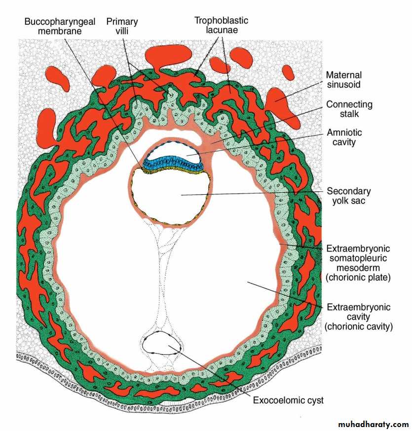 The exocoelomic membrane lining the exocoelomic cavity is largely pinched off forming the exocoelomic cysts that are often seen floating in the chorionic cavity.DAY 14