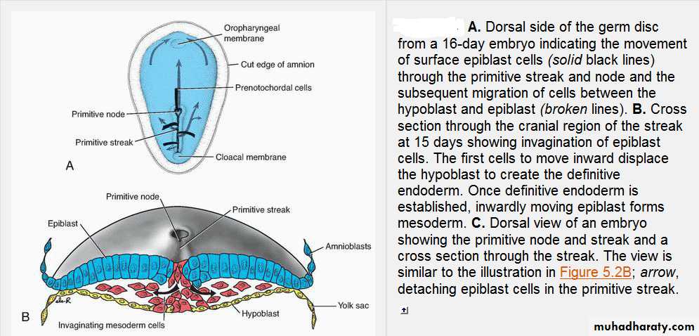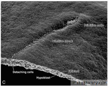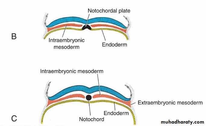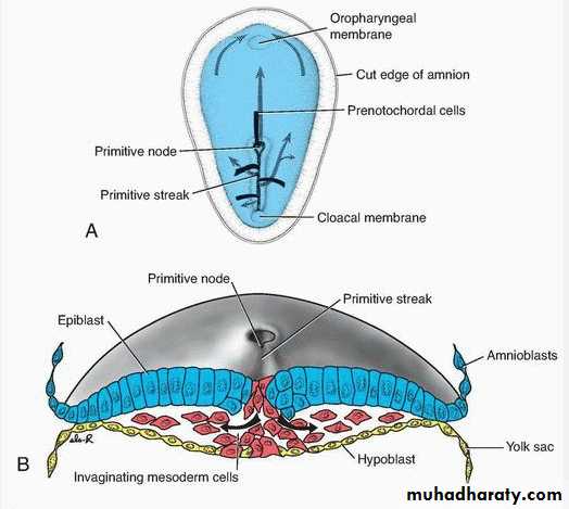 The primitive streak is organized rostrocaudally for the formation of the mesoderm; therefore, invaginating epiblast cells develop into:1.notochord at the cranial end of the node at the primitive pit.