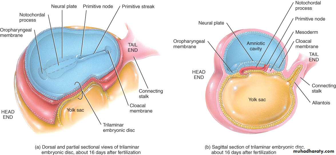 That the primitive streak at the caudal end of the disc continues to supply new cells until the end of the fourth week has an important bearing on development of the embryo.In the cephalic part, germ layers begin their specific differentiation by the middle of the third week, whereas in the caudal part, differentiation begins by the end of the fourth week. Thus gastrulation, or formation of the germ layers, continues in caudal segments while cranial structures are differentiating, causing the embryo to develop cephalocaudally.