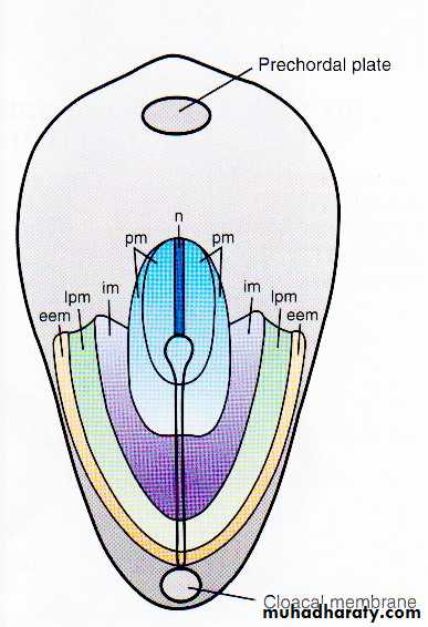 The invaginating mesodermal cells spread laterally and anteriorly to be in contact with the extraembryonic mesoderm, anteriorly these cells surround the prechordal plate which is the region lying just behind the buccopharyngeal membrane.16