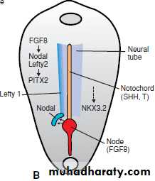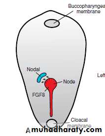 3. Left–right sidedness:When the primitive streak appears, (FGF8) is secreted by cells in the node and primitive streak and induces expression of Nodal but only on the left side of the embryo.