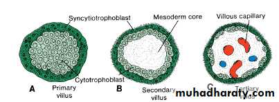 During further development, mesodermalcells penetrate the core of primary villi and grow toward the decidua. Forming the