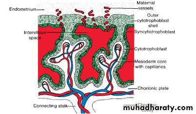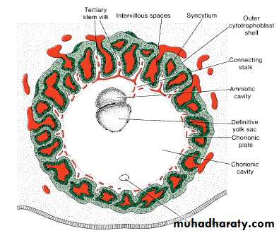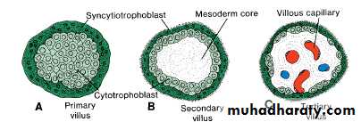 By the end of the third week, mesodermal cells in the core of the villus begin to differentiate into blood cells and small blood vessels, forming the villous capillary system .The villus is now known as a tertiary villus ordefinitive placental villus
