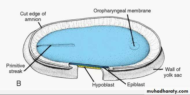 The oropharyngeal membrane at the cranial end of the disc consists of a small region of tightly adherent ectoderm and endoderm cells that represents the future opening of the oral cavity.