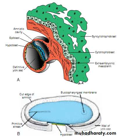 Gradually, they migrate beyond the margin of the disc and establish contact with the extraembryonic mesoderm covering the yolk sac and amnion