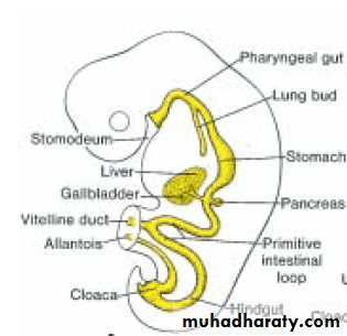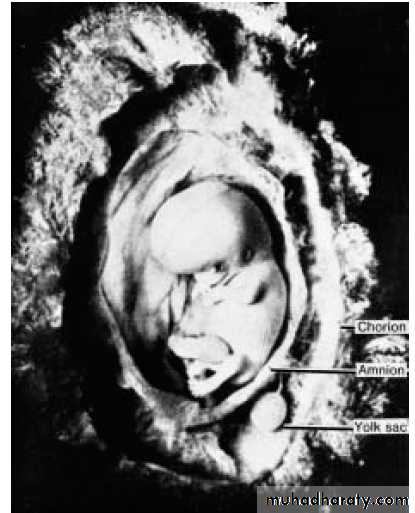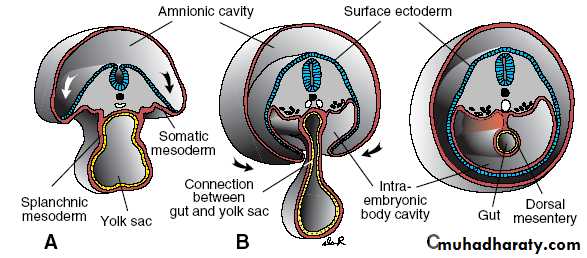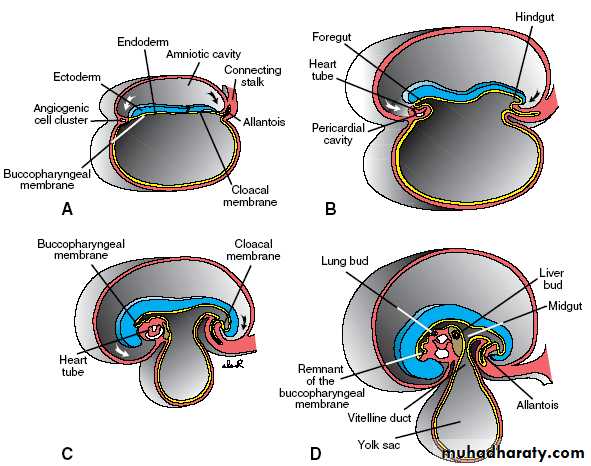 In the fourth week, the buccopharyngeal memb ruptures, establishing an open connection between the amniotic cavity and the primitive gutBy the fifth week, the yolk sac duct, allantois, and umbilical vessels are restricted to the region of the umbilical ring.