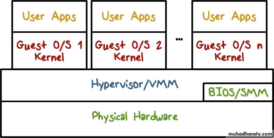 • Smaller and simpler (hypervisor only partitions physical resources among VMs and let us guest OS handle management)