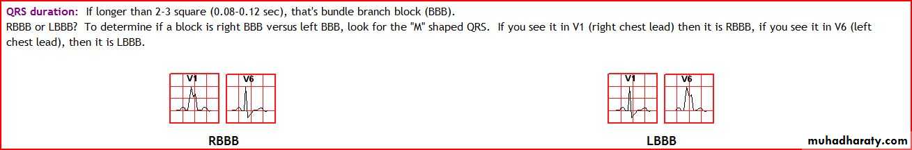 Intervals PR, QRS, QT/QTc (PR 3-5 SMALL SEQUARES)(QRS If longer than 2-3 square (0.08-0.12 sec), that's bundle branch block (BBB).