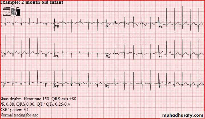 QRS axis (In a newborn, the mean QRS frontal-plane axis normally lies in the range of +110 to +180 degrees. The right-sided chest leads reveal a larger positive (R) than negative (S) wave and may do so for months or years because the right ventricle remains relatively thick throughout infancy-Over the years, the QRS axis gradually shifts leftward, and the right ventricular forces slowly regress. Leads V1, V3R, and V4R display a prominent R wave until 6 mo to 8 yr of age)