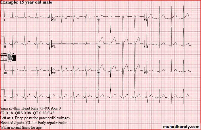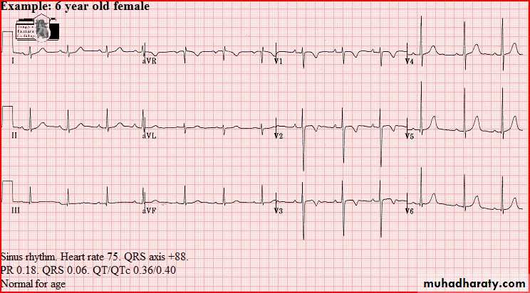 T wave inversion: Infants older than 48 hours of age should have inverted T waves in the right praecordial leads. These findings persist throughout childhood with inversion to V4 being accepted as normal. There is a progressive change to an upright T wave across the praecordial leads from left to right as the child grows older. Until 8 years of age an upright T wave in V1 is considered a sign of right ventricular hypertrophy. Many children will show persistence of an inverted T wave in V1 until their late teens