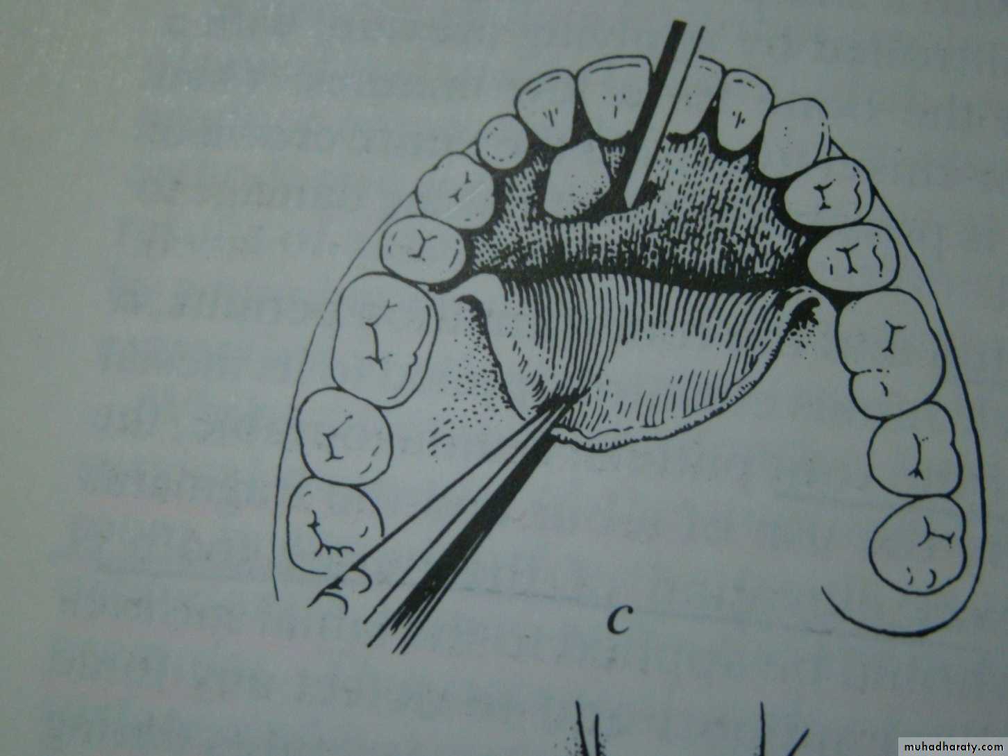 The length of the palatal incision will depend upon whether one or two impacted canines are to be removed .if two canines required extraction the incision line runs in the gingival crevice from the first molar region in one side to the first molar in the opposite side . But if only a single canines to be removed the incision extend from the first molar in the side of operation to the canine of the other side .Mosul university- College of dentistry-oral & maxillofacial surgery department