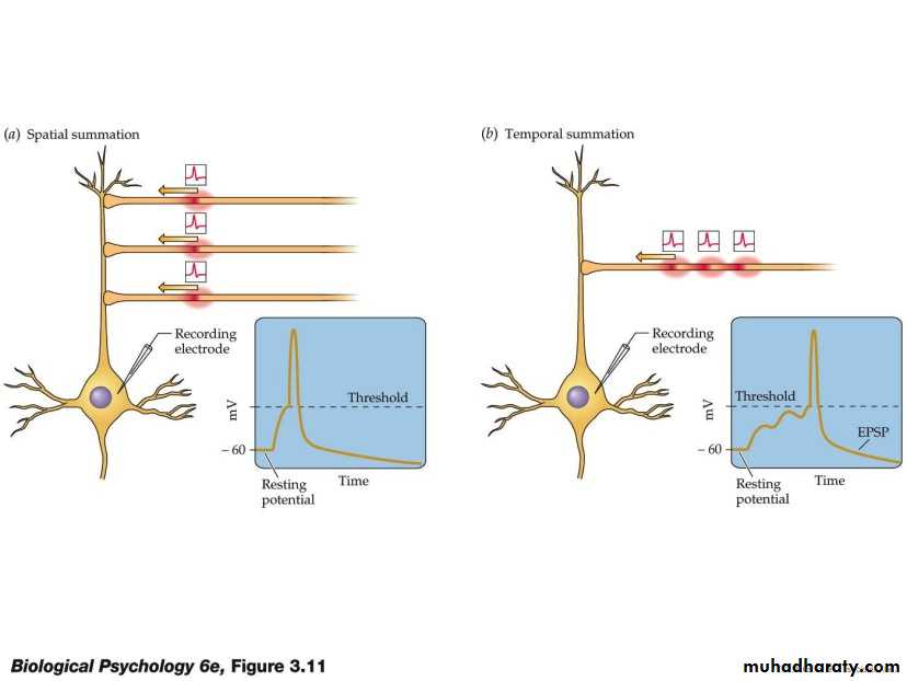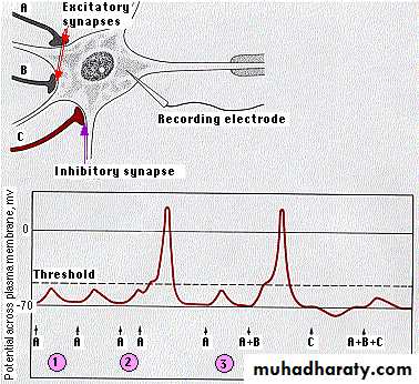The receiving cell is able to integrate these signals. The diagram shows how this works in a motor neuron.