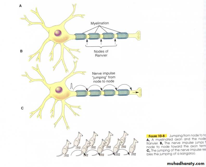 In myelinated neuron, Between areas of myelin are non-myelinated areas called the nodes of Ranvier. So, action potentials only occur along the nodes and, therefore, impulses 'jump' over the areas of myelin - going from node to node in a process called saltatory conduction (salutatory meaning 'jumping'): Because the impulse 'jumps' over areas of myelin, an impulse travels much faster along a myelinated neuron than along a non-myelinated neuron.