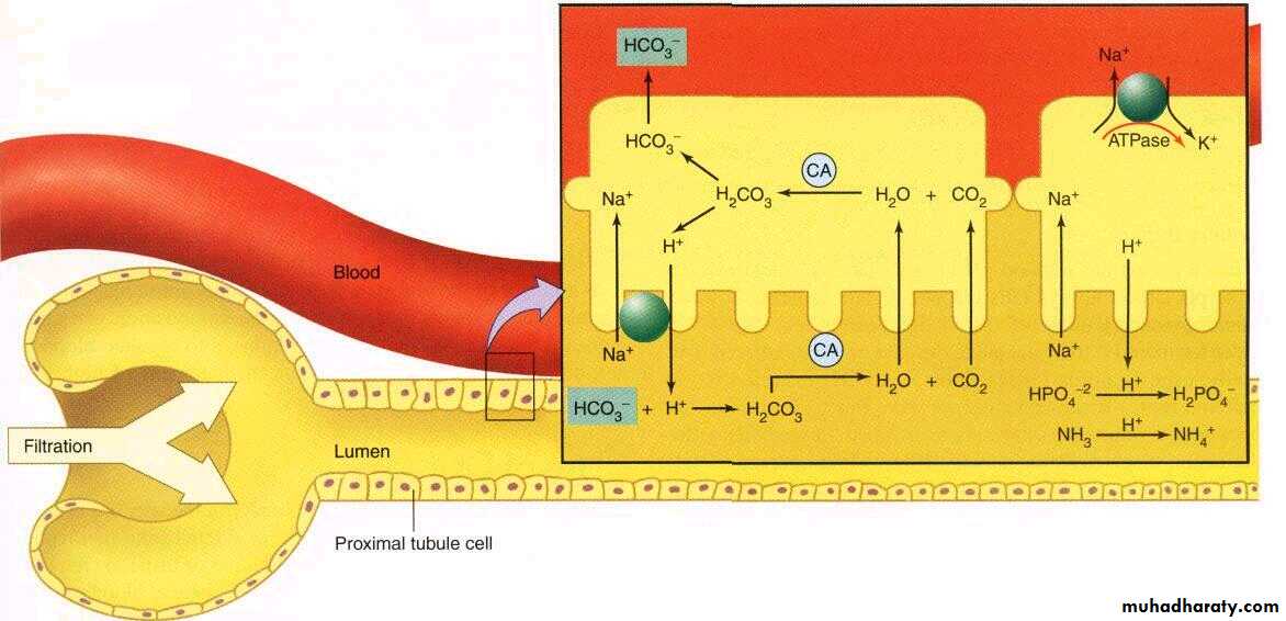 In order to maintain the normal pH (acid-base balance) of the blood, the cells of the proximal convoluted tubules secrete hydrogen ions in the filtrate, they combine with buffers;