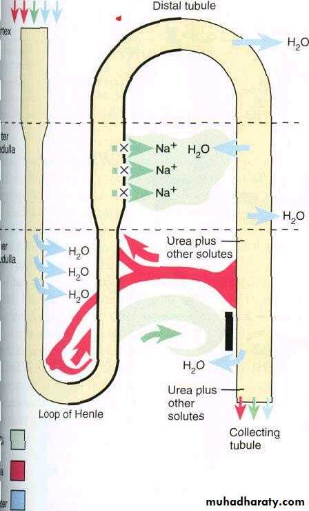 Countercurrent mechanism; refers to inter-actions between the descending and ascending limbs, decreasing water concentration in descending limb encounters an increasing solute concentration → fluid flowing in opposite directions right alongside each other, (multiplies the concentration of interstitial fluid of renal medulla, very high at deepest part of medulla)