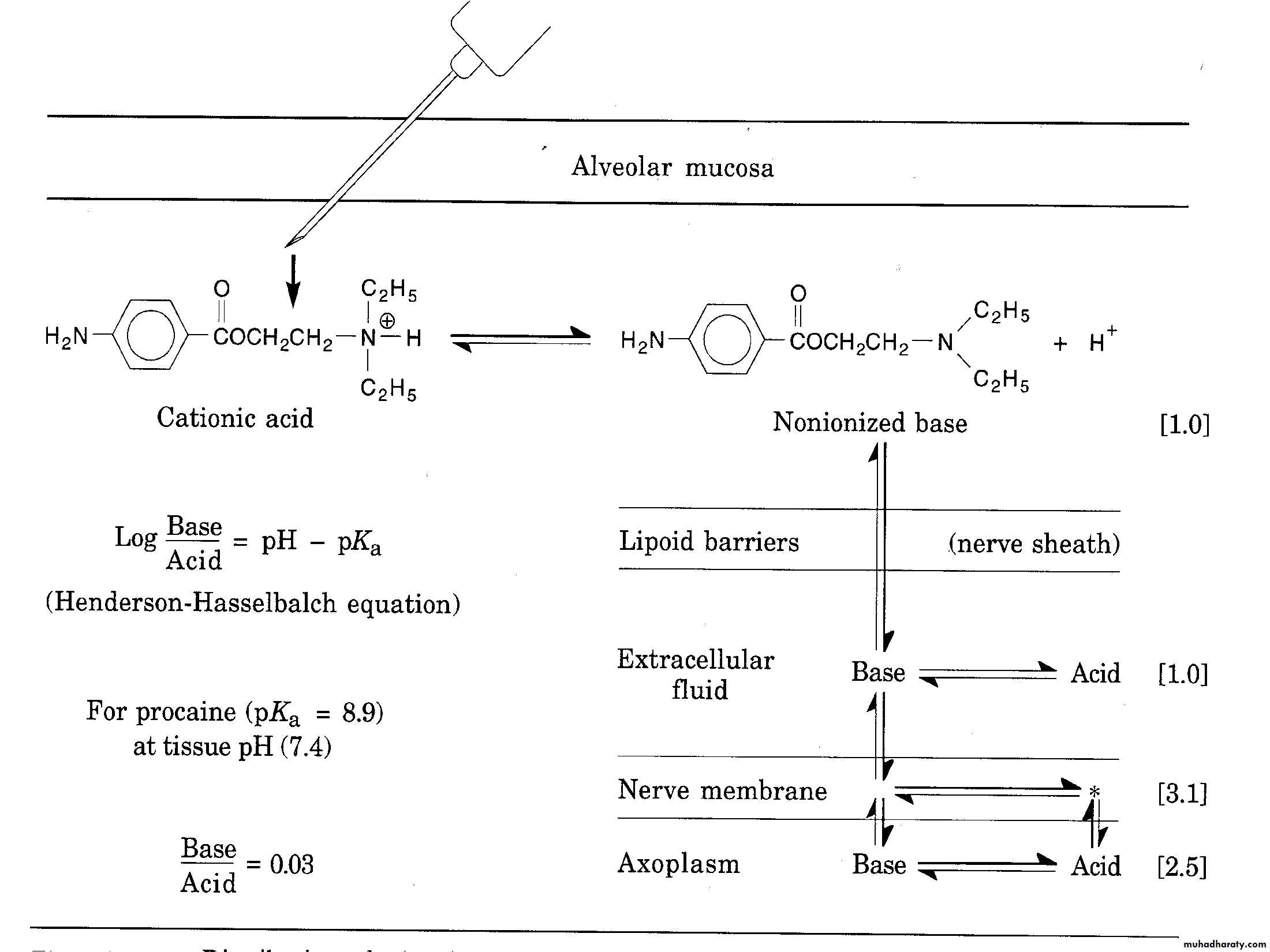 Local anesthetic agent after injection and with function of plasma buffering will dissociate into free base form and cataionic formFree base form cross the cell membrane