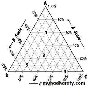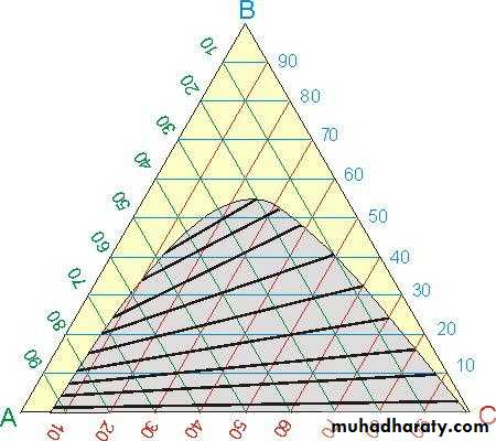 Each of three corners or apexes of the triangle represent 100% by weight of one component (A, B, or C). As a result, that same apex will represent 0% of the other two components. For example, the top corner point represents 100% B. Each side of the triangle represents a binary mixture where two components mixed together and any line drawn parallel to one of the sides shows the percentage of a particular component. By dividing each line into 100 equal units, the location of a point along the line can be directly related to the percent concentration of one component in a two-component system. In going along a line bounding the triangle so as to represent the concentration in a two-component system, it does not matter whether we proceed in a clockwise or counterclockwise direction around the triangle, provided we are consistent. If a line is drawn through any apex to a point on the opposite side then all systems represented by points on such a line have a constant ratio of two components, in this case A and B.