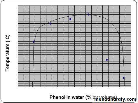 As the diagram (figure1) indicates, at low and high percentages of phenol, water and phenol mix completely, forming a single liquid phase. However, at intermediate compositions (and below the critical temperature) mixtures of phenol and water separate into two liquid phases. Point "h" in the figure is the critical point. Above the critical temperature, phenol and water are completely miscible.Figure 1: The liquid-liquid phase diagram of phenol and water. This diagram is from Martin's Physical Pharmacy and Pharmaceutical Sciences.