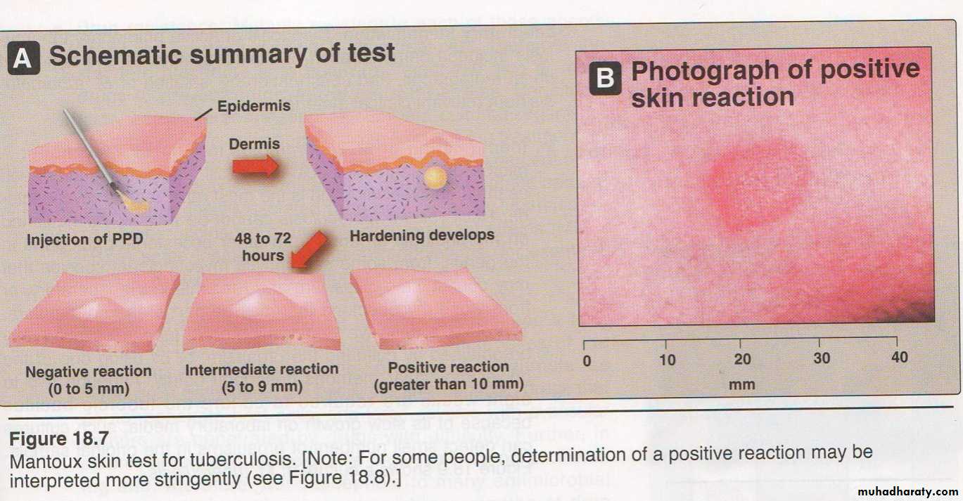 Principle: a large amount of tuberculin injected IC into hypersensitive host may give rise to severe local reaction.An individual who has had a primary infection with tubercle bacilli develops induration, edema and erythema within 24-48 hrs. The test should be read in 48-72 hrs.