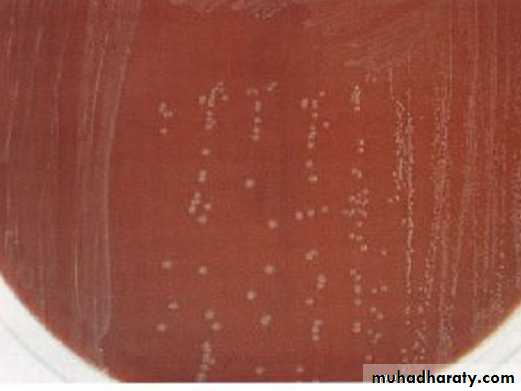 Cultural(macroscopical) characteristics:This microorganism is very fastidious in its growth that need enriched media. The preferable medium for culturing Heamophilus spp is chocolate agar on which it would give flat, grayish – brown colonies with diameter of 1-2mm at 37°C