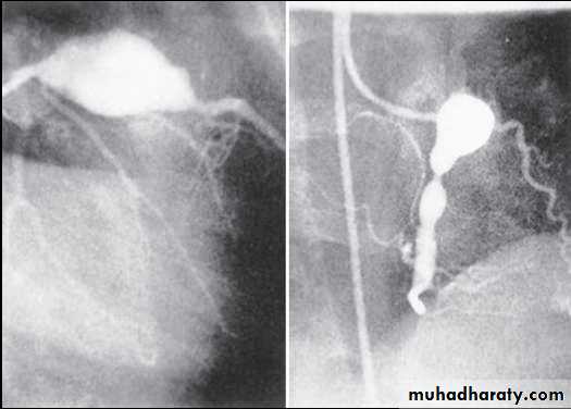 Coronary angiogram demonstrating giant aneurysm of the left anterior descending coronary artery (LAD) with obstruction and giant aneurysm of the right coronary artery (RCA) with an area of severe narrowing in 6 yr old boy.