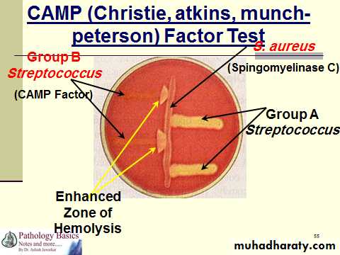 • β-haemolysis: wide, clear, translucent zone of complete