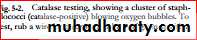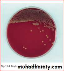 Grows aerobically as yellow or gold colonies on blood agar, catalase-positive (this differentiates them fromthe catalase-negative streptococci).Other tests used to differentiate the more virulent Staphylococcus aureus from the less pathogenic Staphylococcus epidermidis include the following.Coagulase test
