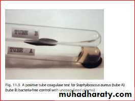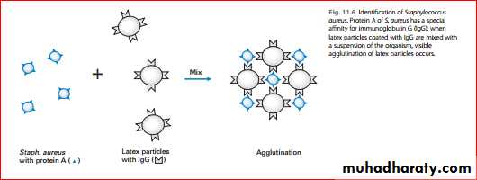 Protein A, synthesized by almost all strains of Staphylococcus aureus, has a special affnity to the Fc fragment of immunoglobulin G (IgG). Hence, when latex particles coated with IgG (and fbrinogen) are mixed with an emulsifed suspension of Staphylococcus aureus on a glass slide, visible agglutination of the latex particles occurs; no such reaction is seen with Staphylococcus epidermidiOther tests