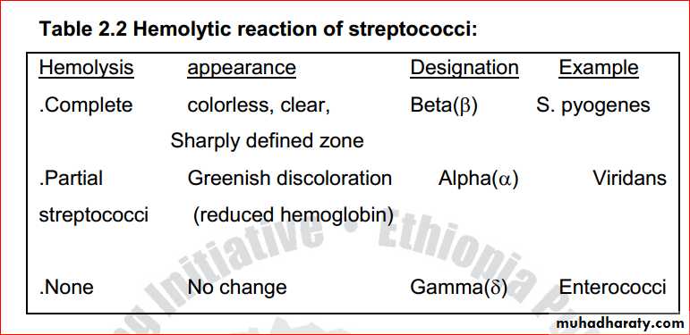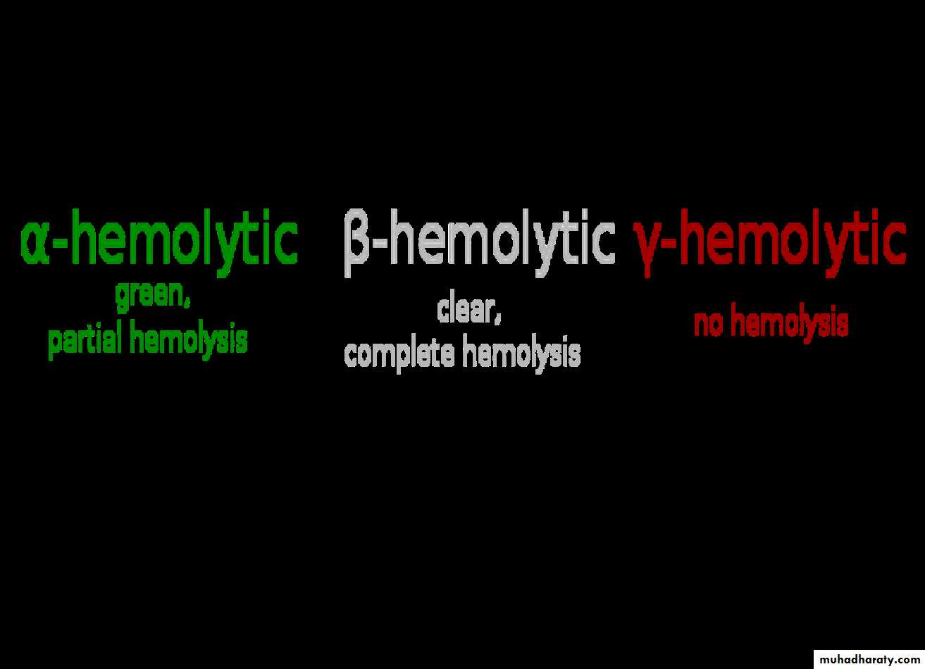 haemolysis around the colony, e.g. Streptococcus pyogenes• no haemolysis (γ-haemolysis), e.g. non-haemolytic streptococci.