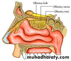 The olfactory nerves, concerned with smell, arise from cells in the olfactory epithelium in the superior part of the lateral and septal walls of the nasal cavity. The central processes of these cells (forming the olfactory nerve) pass through the cribriform plate and end in the olfactory bulb, the rostral expansion of the olfactory tract.39